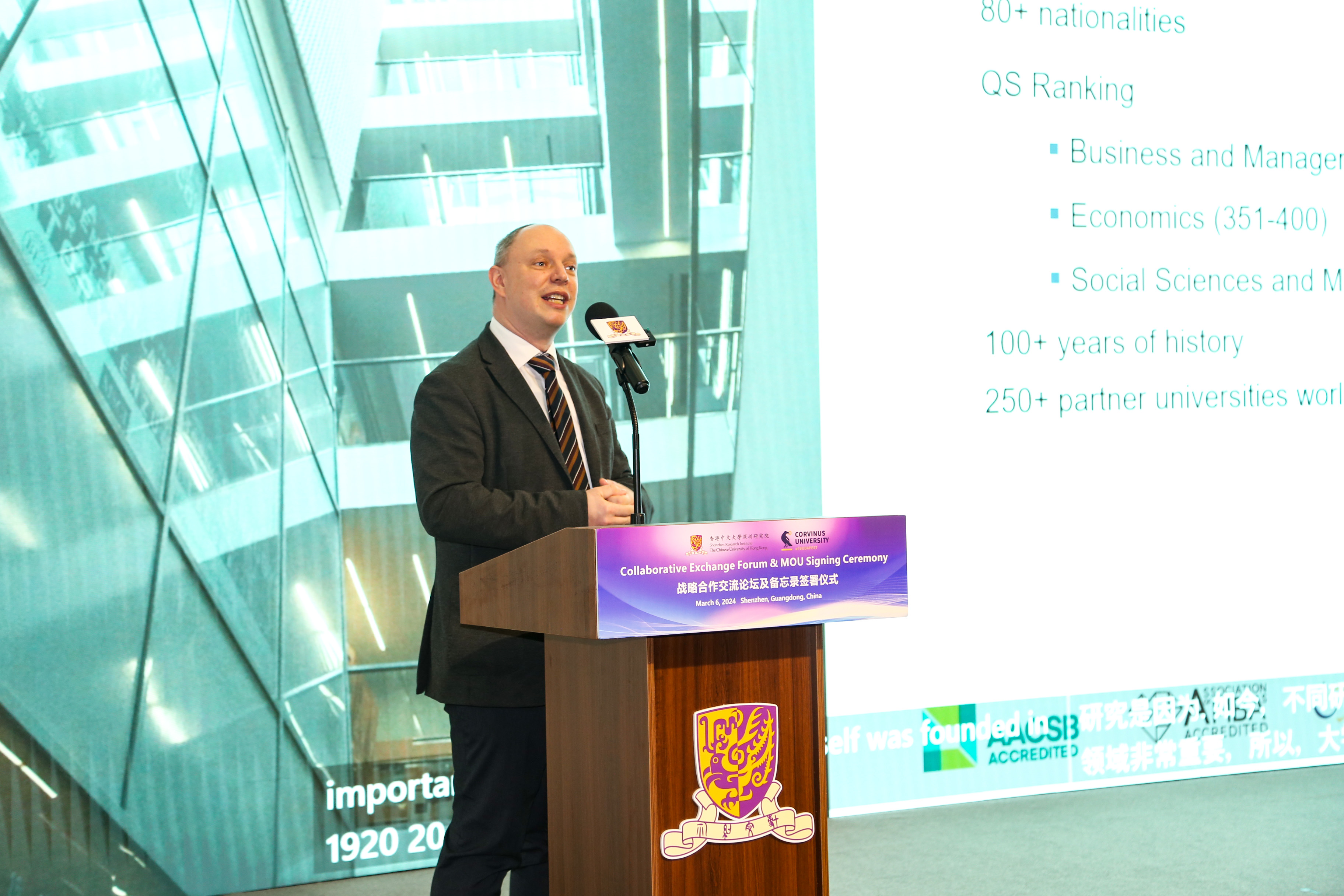 2024年3月6日,香港中文大学(港中大)深圳研究院与布达佩斯考文纽斯大学(Corvinus University of Budapest, CUB)签署战略合作框架协议,加强学术、科技和人才培养上的国际交流合作,深化双方伙伴关系,共同推动“中匈”科学技术的发展。