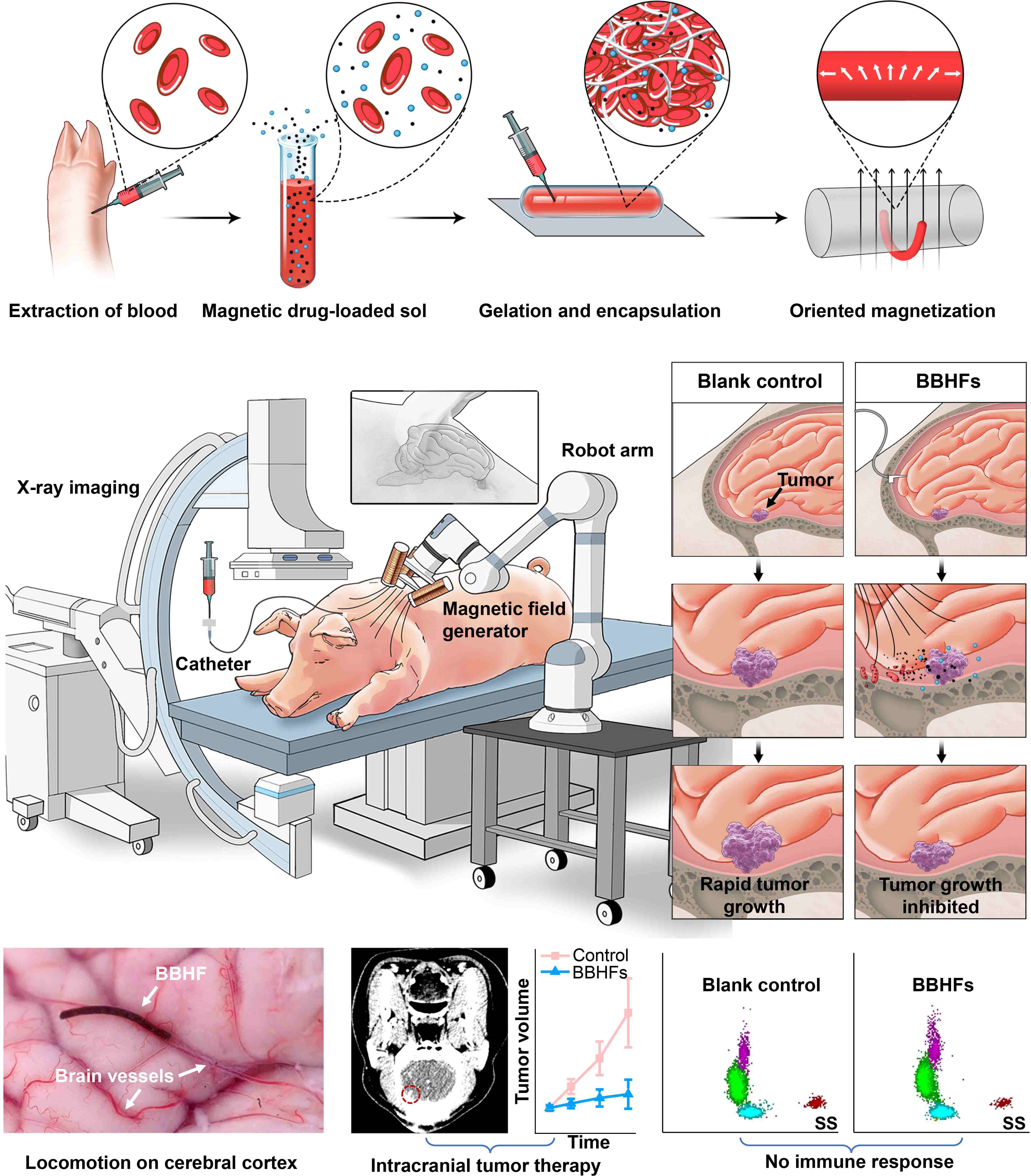 香港中文大学(港中大)机械与自动化工程学系张立教授,联同深圳大学化学与环境工程学院王奔副教授及中国科学院深圳先进技术研究院(SIAT)研究员徐天添博士等组成的港深联合团队,在SIAT–港中大机器人与智能系统联合实验室成功研发全球首个磁控血液凝胶纤维机械人,于颅内肿瘤治疗领域取得重要突破。有关研究成果已在国际知名期刊《Nature Biomedical Engineering》上发表。张立教授、王奔副教授及徐天添博士为这次研究的通讯作者。