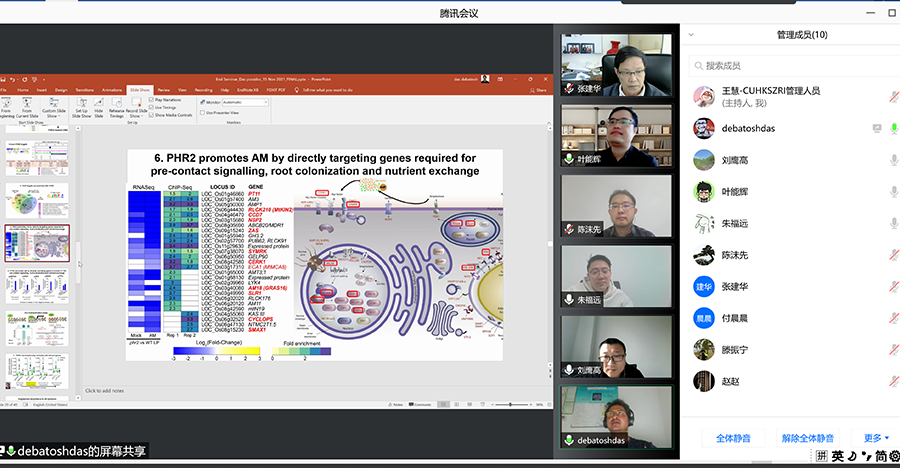 香港中文大学农业生物技术国家重点实验室深圳基地团队(以下简称“农业团队”)的滕振宁博士后开题报告会、Debatosh Das博士后期满考核报告会于11月15日上午以视频答辩的形式在香港中文大学深圳研究院顺利举行。